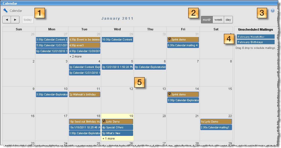 - Use a simple "mouse-over" to see the name of a mailing, subject line and status or view event descriptions, frequency and end dates.
